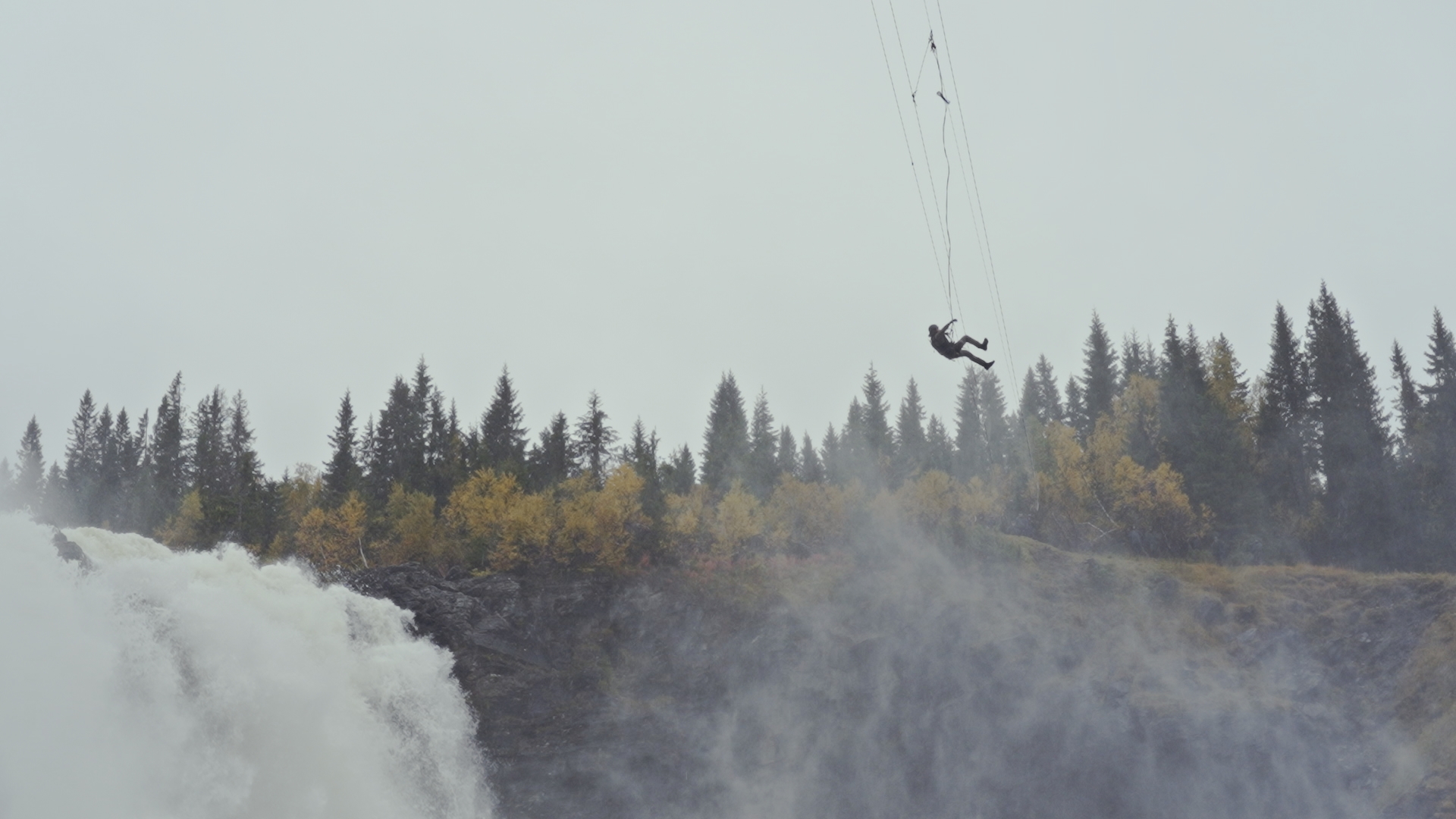 Vi kommer till Tännforsen och en del av mig blir glad. Jag hade sett den utmaningen tidigare säsonger och det var den jag verkligen ville göra. (Tidigare låg man på en vajer och drog sig över, medan vi skulle gå på ett rep och hålla i vajern över oss.)
